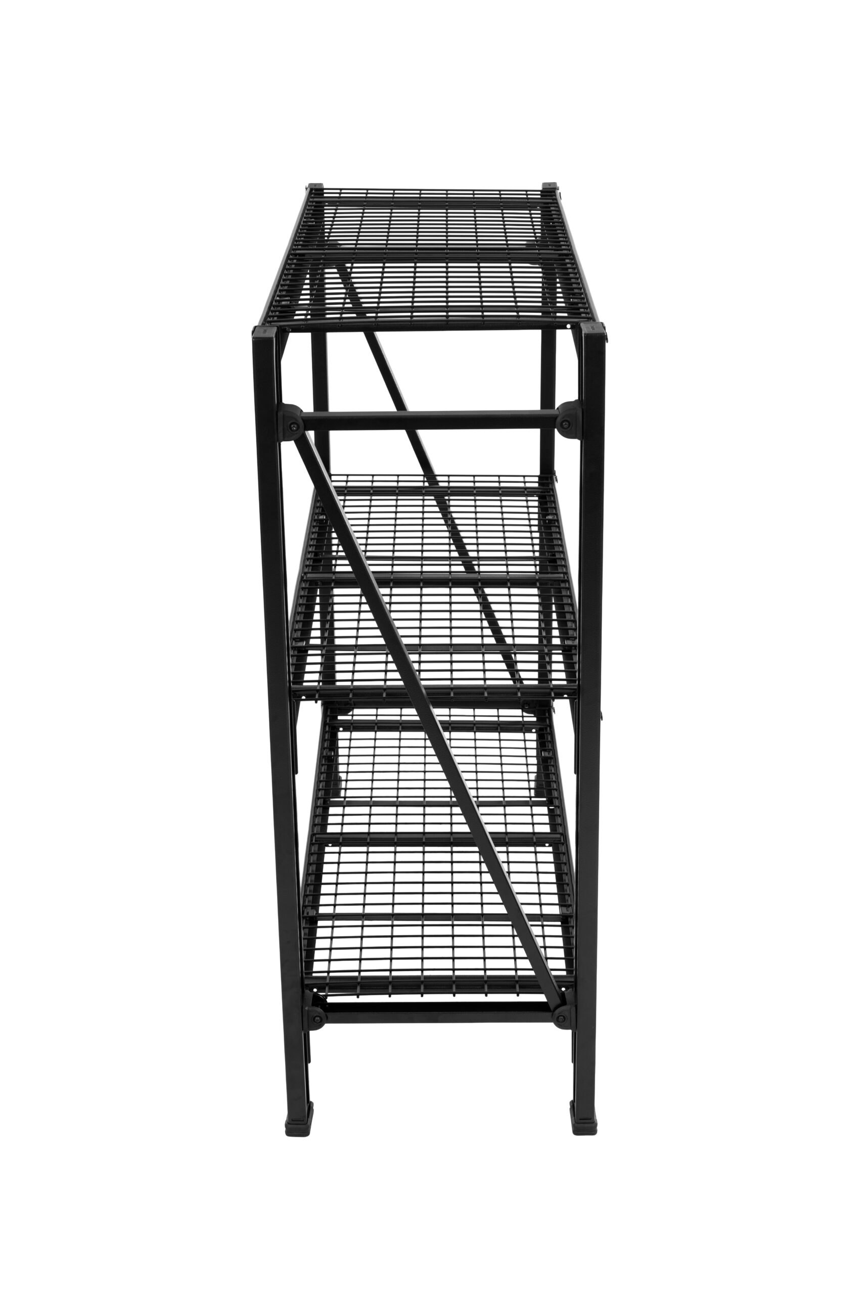 Foldable dual wire shelves provide more storage options and compact packaging for easy transportation